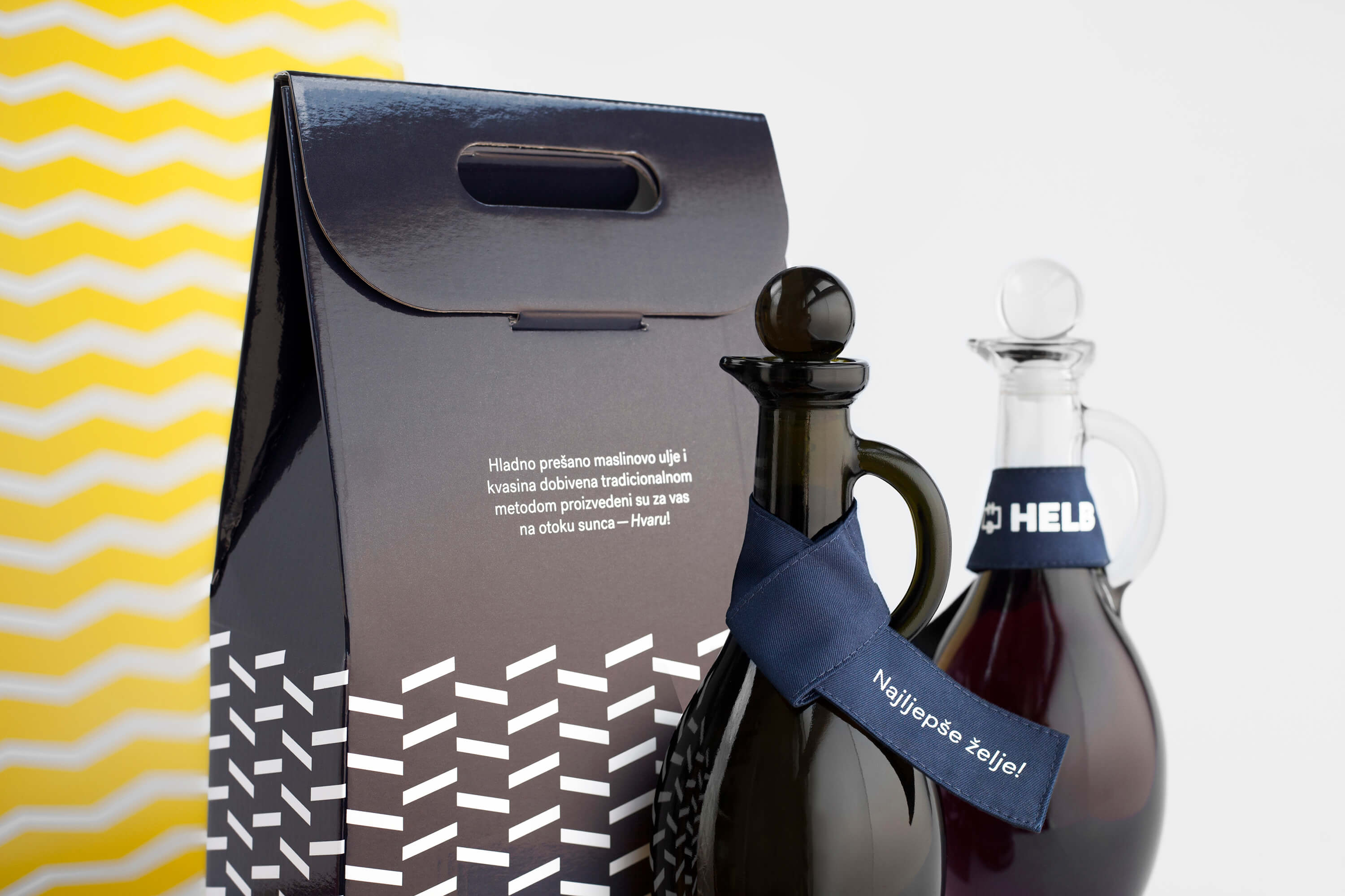 Corporate gift packaging contains two glass bottles of olive oil and vinegar, produced in a traditional manner on the sunny island of Hvar.
